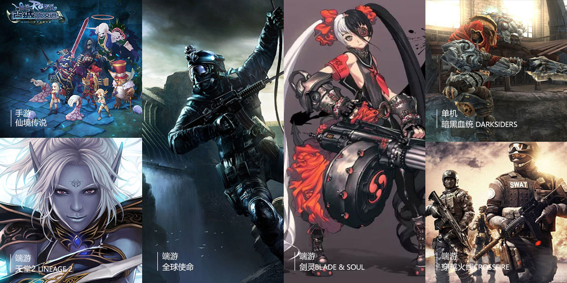 《穿越火線》、《天堂2》、《地獄之門(mén)》、《暗黑血統(tǒng)》、《全球使命》、《戰(zhàn)爭(zhēng)機(jī)器資料篇》、《劍靈》等項(xiàng)目。